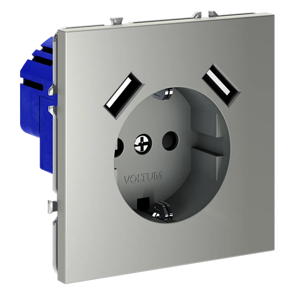 Розетка встраиваемая VOLTUM S70 с заземлением и защитными шторками, 16А, с USB, A+A, (сталь)